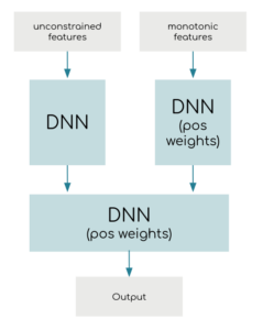 To help the model better understand these correlations, we can force it to have a Monotonic Behaviour. Wilson Silva, et al. proposed an effective and intuitive methodology to do it in a paper with our collaboration. Their approach consists of splitting monotonic features from unconstrained features and making them follow two different streams, as shown in the figure below. One stream is designed for unconstrained features and consists of a conventional DNN. The second stream, designed for monotonic features, consists of a DNN where the weights were forced to be positive. In the end, the two independent streams concatenate to give the final output.