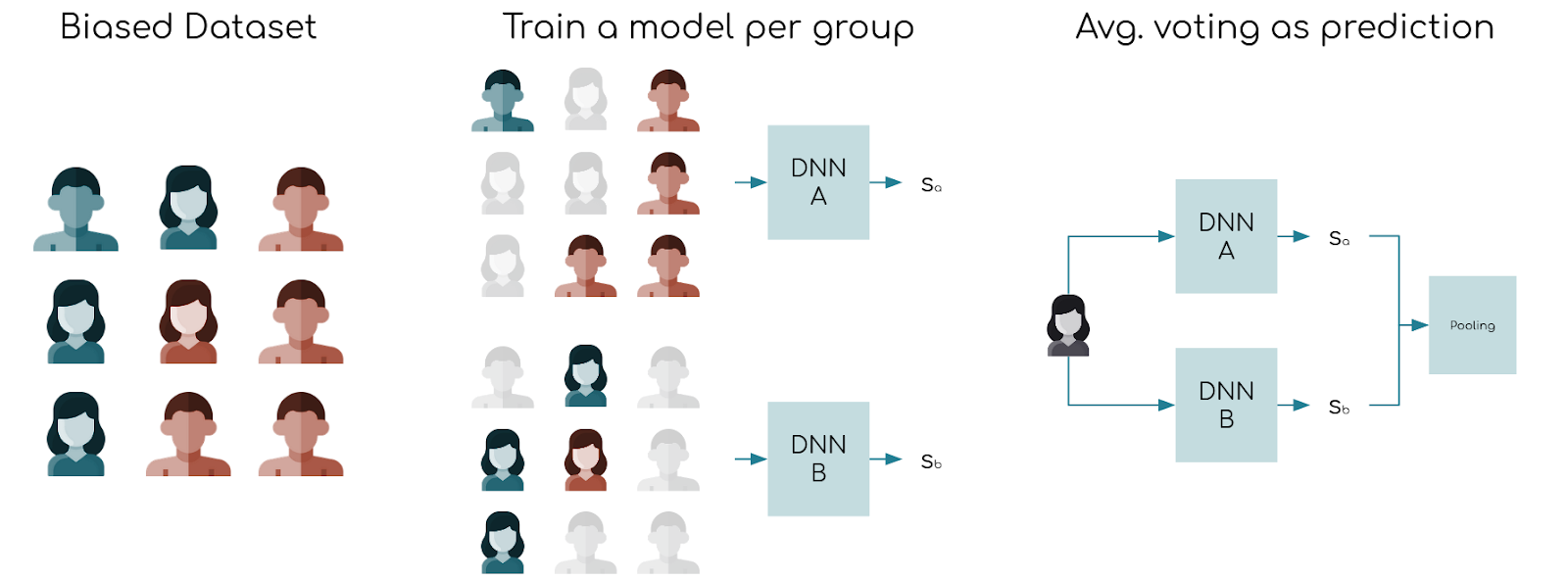As shown in the above image, this method consists of two parts. Firstly, train a different model for each group and then, compute the average prediction to get the final result.