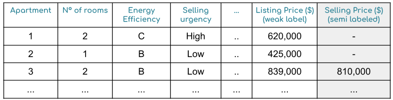 However, this approach would be biased towards the agency from which we gathered the real selling price. Furthermore, we would not be, explicitly, taking advantage of having the listing price available, which can be used as a weak label.