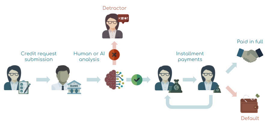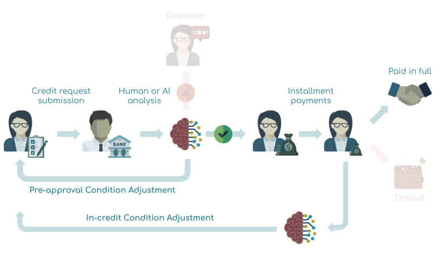 Artificial Intelligence has played a major role in solving the first side of the equation -the creditor side-, bringing an objective and reproducible credit score estimation of the prospective debtor, at the expense of bringing further opacity to the process for the prospective debtor. In this blogpost, we will go through the current paradigm and how we could tackle it differently to perform a more comprehensive approach, identifying current limitations as well as potential solutions from an AI point of view. The ideas described in this article, can be applied to both financial entities and subscription-based business models that face default as a source of involuntary churn.