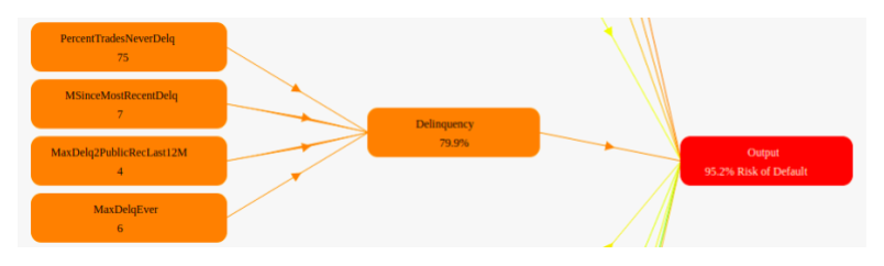 From the picture above we can see that the delinquency is a subscale that can be given by those four features and that is contributing to the risk factor (warmer colors represent a higher risk). I would recommend the reader to read Cynthia’s newest article on black box models: “Stop explaining black box machine learning models for high stakes decisions and use interpretable models instead”