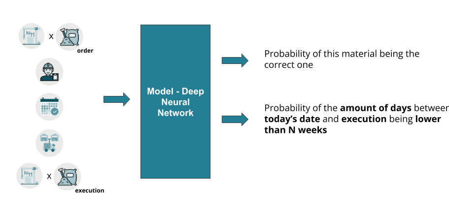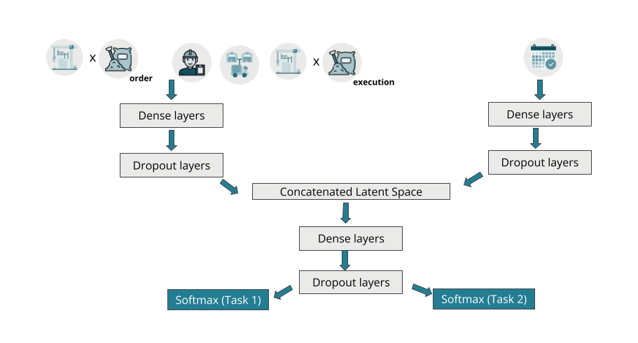 Regarding model architecture, we can build a two stream model: we separate the features belonging to the delay between order and execution and difference between ordered and executed material, since we’ll have multiple rows with similar features, and this tells the model to treat them differently in an explicit way.