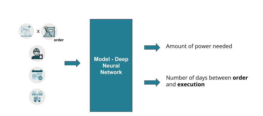In this initial approach, we take the features at order time and try to predict the amount of power needed, and the number of days between order and execution. This is done using a multitask model, with two regression tasks.