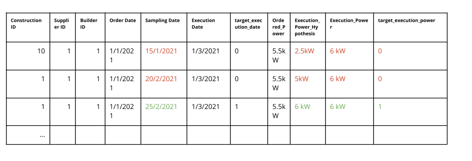 In green are shown the rows where the target is positive, and in red where they are negative. For instance, a sampling date of 25/2/2021 is close enough to our execution_date to consider as a positive target for prediction, while 20/2/2021 is not. In terms of execution power, the target is positive when Execution_Power_Hypothesis equals Execution_Power.